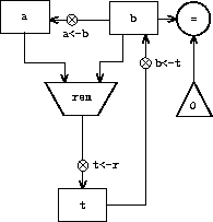 A machine to carry out this algorithm must keep track of two numbers, a and b, so let us assume that these numbers are stored in two registers with those names. The basic operations required are testing whether the contents of register b is zero and computing the remainder of the contents of register a divided by the contents of register b. The remainder operation is a complex process, but assume for the moment that we have a primitive device that computes remainders. On each cycle of the GCD algorithm, the contents of register a must be replaced by the contents of register b, and the contents of b must be replaced by the remainder of the old contents of a divided by the old contents of b. It would be convenient if these replacements could be done simultaneously, but in our model of register machines we will assume that only one register can be assigned a new value at each step. To accomplish the replacements, our machine will use a third "temporary" register, which we call t. (First the remainder will be placed in t, then the contents of b will be placed in a, and finally the remainder stored in t will be placed in b.)