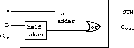 The advantage of making this definition is that we can use half-adder itself as a building block in creating more complex circuits. Figure 3.26, for example, shows a full-adder composed of two half-adders and an or-gate.noteA full-adder is a basic circuit element used in adding two binary numbers. Here A and B are the bits at corresponding positions in the two numbers to be added, and Cin is the carry bit from the addition one place to the right. The circuit generates SUM, which is the sum bit in the corresponding position, and Cout, which is the carry bit to be propagated to the left. We can construct a full-adder as follows: