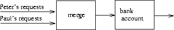 On the other hand, if we look closely, we can see time-related problems creeping into functional models as well. One particularly troublesome area arises when we wish to design interactive systems, especially ones that model interactions between independent entities. For instance, consider once more the implementation a banking system that permits joint bank accounts. In a conventional system using assignment and objects, we would model the fact that Peter and Paul share an account by having both Peter and Paul send their transaction requests to the same bank-account object, as we saw in section 3.1.3. From the stream point of view, where there are no "objects" per se, we have already indicated that a bank account can be modeled as a process that operates on a stream of transaction requests to produce a stream of responses. Accordingly, we could model the fact that Peter and Paul have a joint bank account by merging Peter's stream of transaction requests with Paul's stream of requests and feeding the result to the bank-account stream process, as shown in figure 3.38.