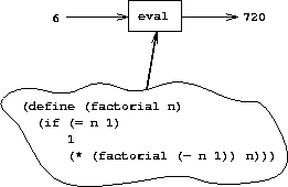 In thinking about a Lisp program that evaluates Lisp expressions, an analogy might be helpful. One operational view of the meaning of a program is that a program is a description of an abstract (perhaps infinitely large) machine. For example, consider the familiar program to compute factorials: